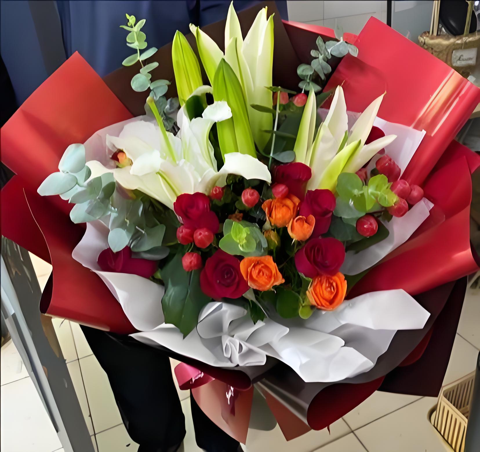 荷泽曹县花店包11枝红玫瑰、2枝多头白百合、6枝橙色多头玫瑰、红豆、尤加利叶